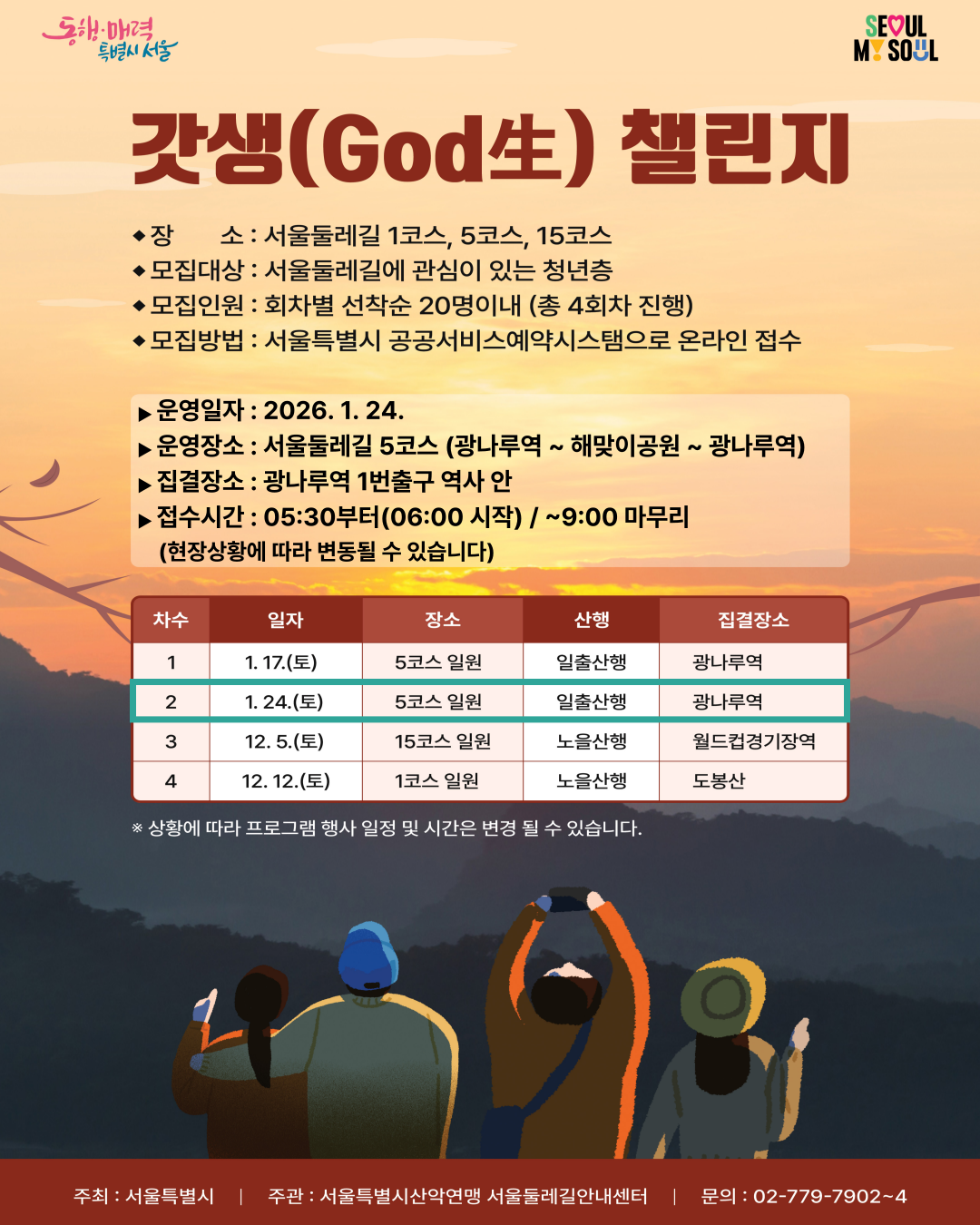 ** 부득이한 사유로 불참 사유 발생시 서울둘레길안내센터(02-779-7902)로 연락부탁드립니다.