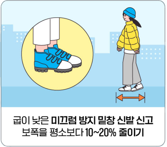 - 굽이 낮은 미끄럼 방지 밑창 신발 신고 보폭을 평소보다 10~20% 줄이기