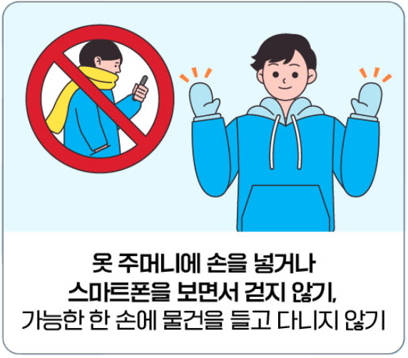 - 옷 주머니에 손을 넣거나 스마트폰을 보면서 걷지 않기, 가능한 한 손에 물건을 들고 다니지 않기