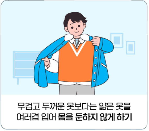 - 무겁고 두꺼운 옷보다는 얇은 옷을 여러 겹 입어 몸을 둔하지 않게 하기