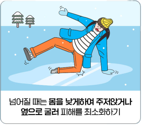 - 넘어질 때는 몸을 낮게 하여 주저앉거나 옆으로 굴러 피해를 최소화하기