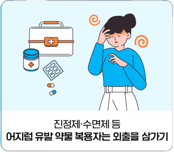 - 진정제·수면제 등 어지럼 유발 약물 복용자는 외출을 삼가기