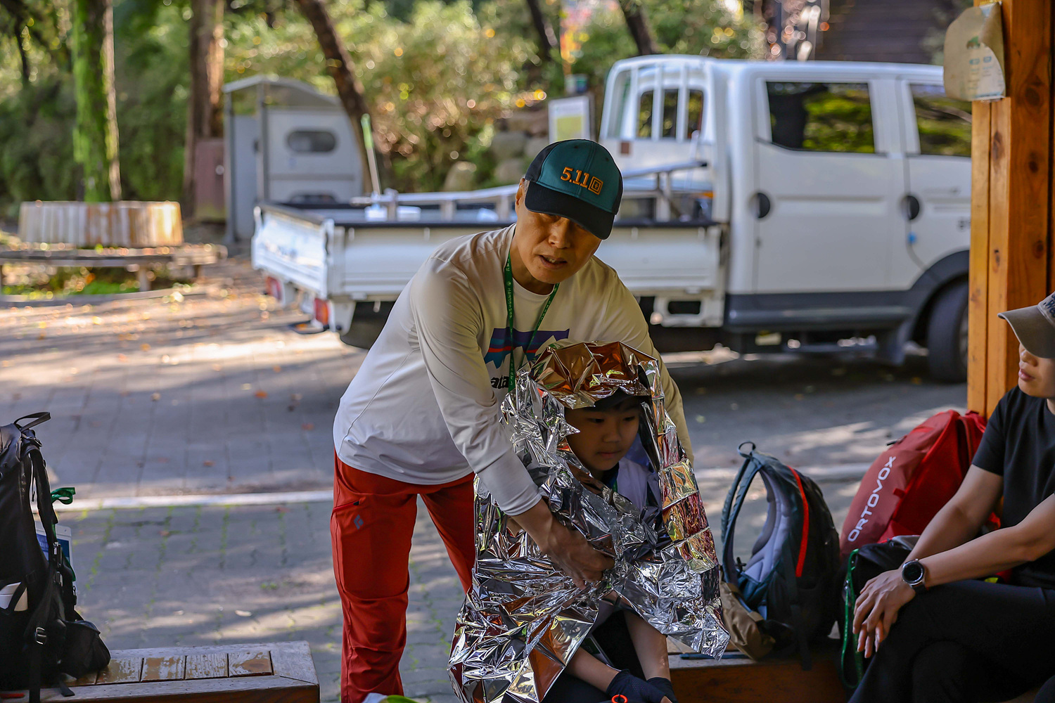 이날은 특히 이머전시 블랑킷(비상담요) 사용법을 알아봤어요. 이머전시블랭킷은 얇은 은박지를 손바닥만 하게 접어 놓은 것으로, 비상시 아주 요긴한 장비입니다. 아버지와 함께 현장체험학습으로 참여한 초등학교 5학년 학생이 모델이 되어 이머전시 담요 사용 실습도 해 보았습니다.