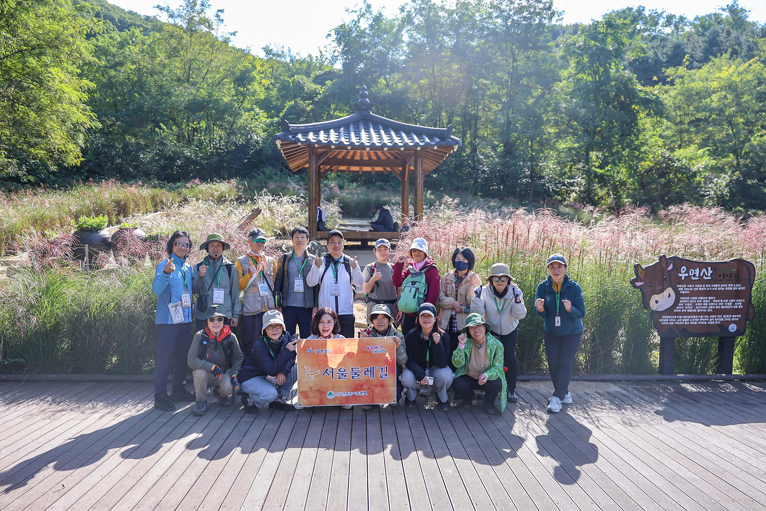 소망탑 삼거리에서 트레킹을 마치고 가을 햇살 아래 눈부신 억새들이 춤추는 우면산 억새원으로 이동해 가을감성 듬뿍 받으며 3차 숲해설을 마쳤습니다.